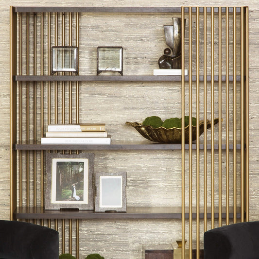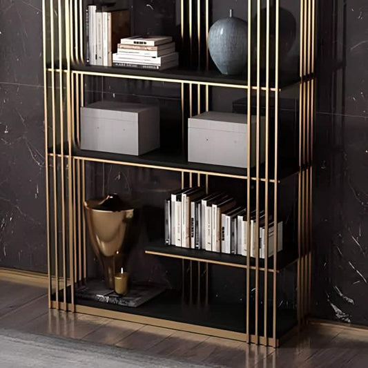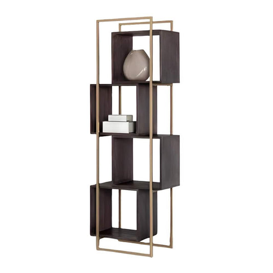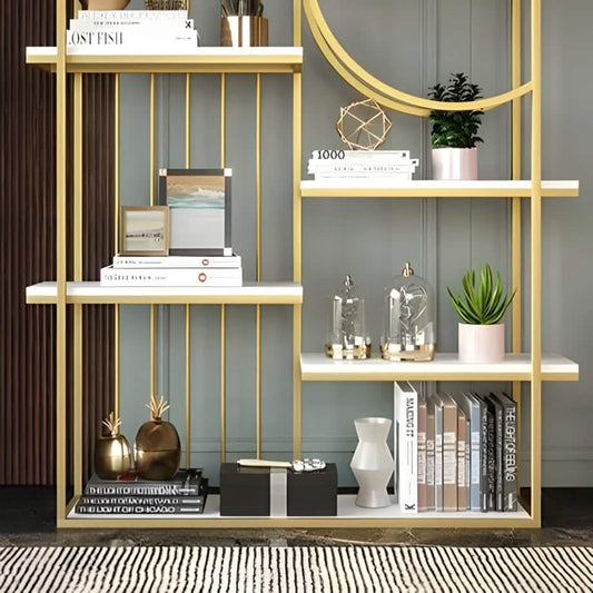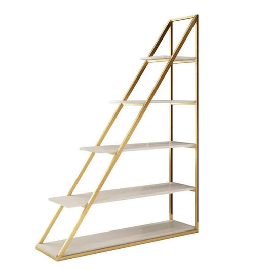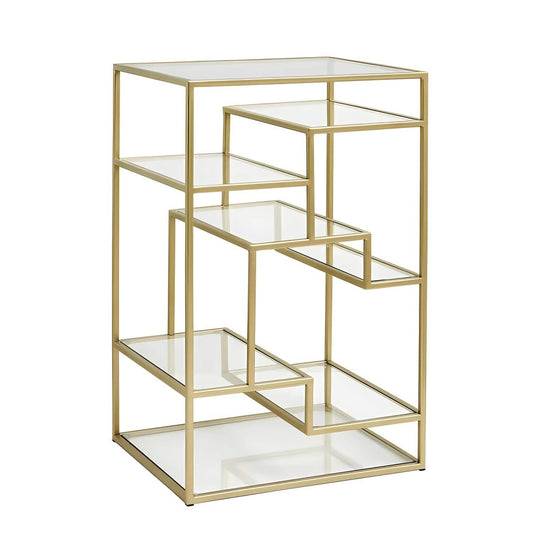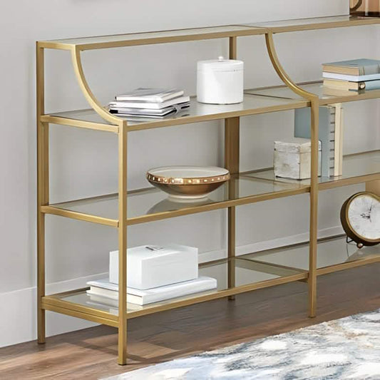 وحدة أرفف ذهبية اللون من المعدن والزجاج الشفاف