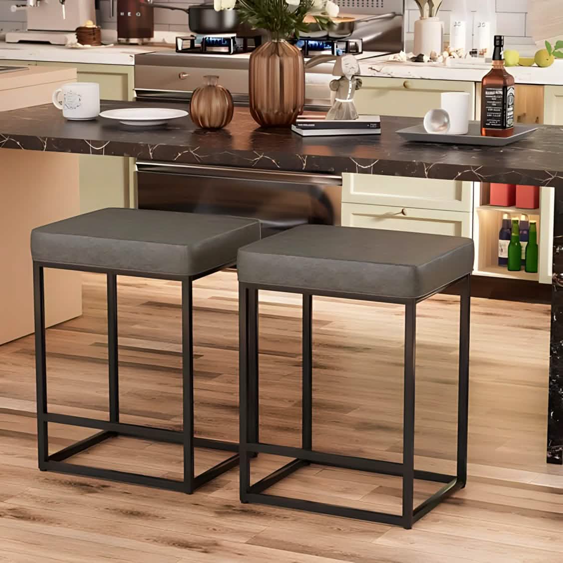 كرسي بار معدن و جلد رمادي مع أسود